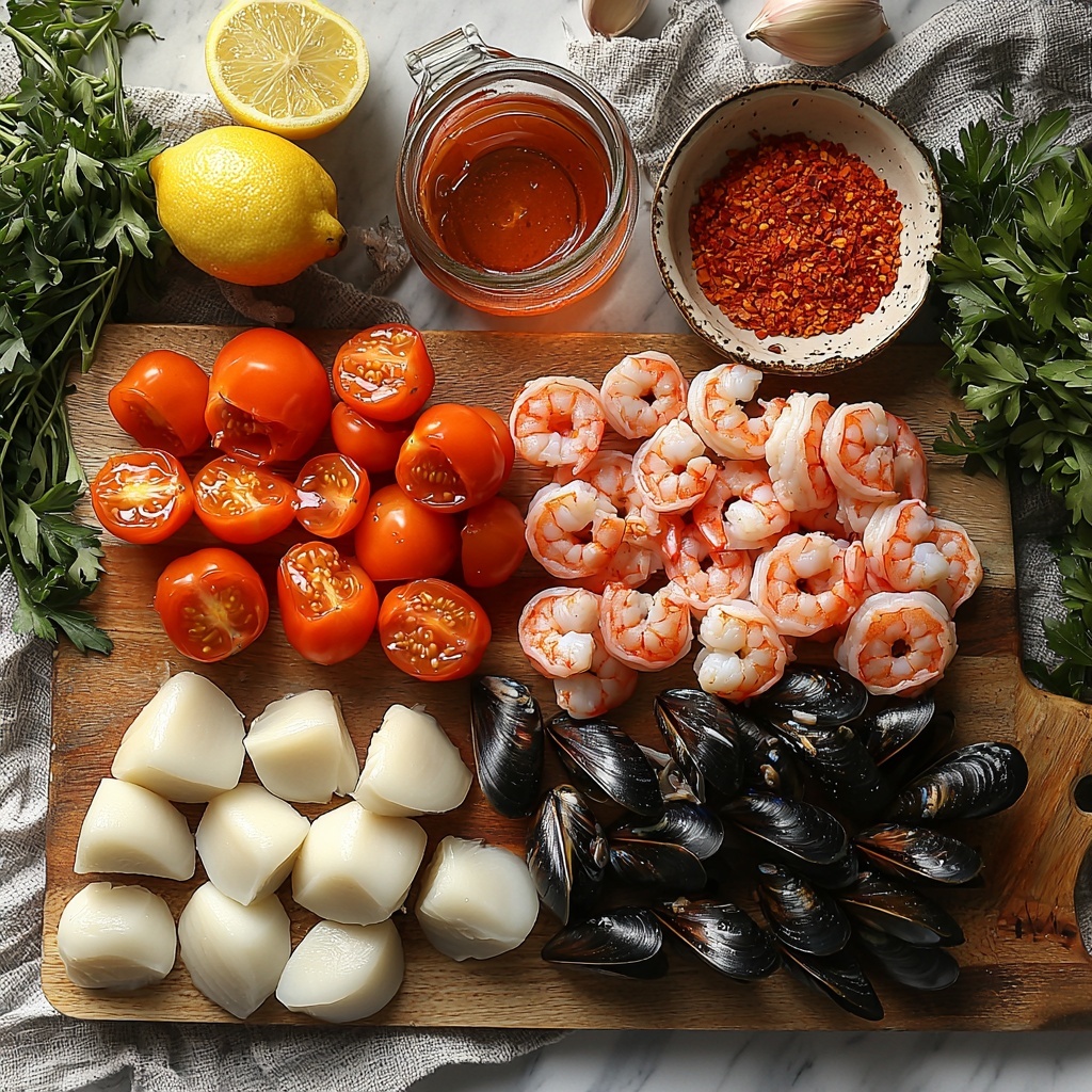 - Prepare the Seafood: Clean and devein the shrimp, scrub the mussels thoroughly, and pat the scallops dry. Set aside to keep ready for cooking.