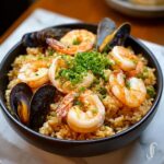 This Seafood Rice recipe combines succulent shrimp, fresh mussels, and tender scallops with fragrant long-grain rice cooked in a rich chicken or seafood broth. Enhanced with garlic, onion, smoked paprika, and a hint of saffron, it creates a gourmet yet easy-to-make dish perfect for a comforting meal at home.