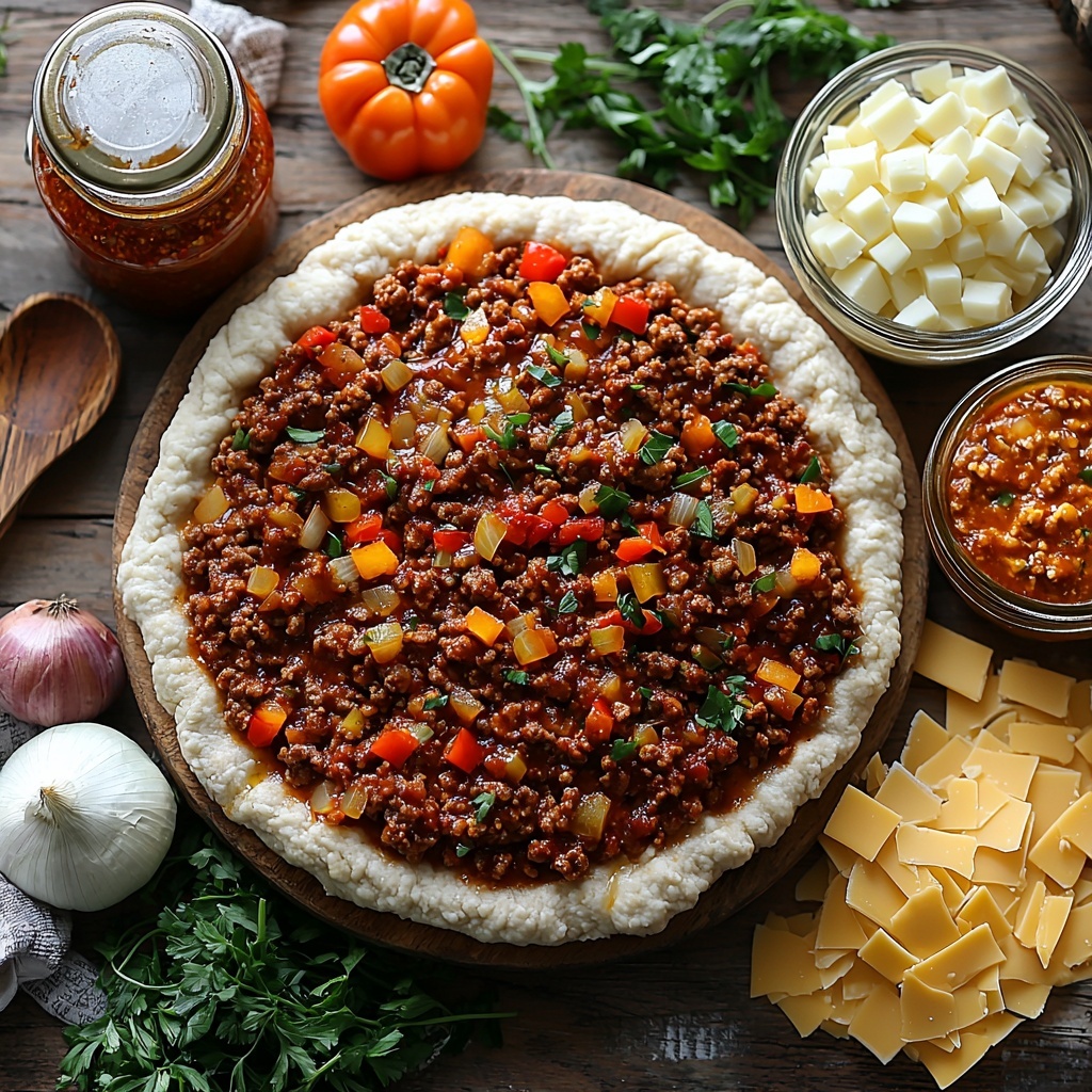 - Assemble Pizza: Place the pre-made pizza crust on a baking sheet. Evenly spread the sloppy joe mixture over the crust, then top it with shredded mozzarella and cheddar cheeses to create a cheesy, flavorful topping.