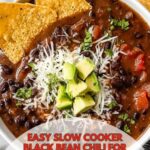 Turn your Slow Cooker Black Bean Chili Recipe into a fun taco bar by serving it alongside tortillas, chopped onions, jalapeños, and lime wedges. Alternatively, use the chili as a topping for baked sweet potatoes or even as a filling for stuffed peppers for a twist that’s sure to impress.