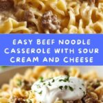 A creamy and comforting Sour Cream Beef Noodle Casserole featuring browned ground beef, tender egg noodles, and a rich mushroom soup and sour cream sauce, topped with melted cheddar cheese and optional crunchy breadcrumbs. Perfect for a hearty family meal.