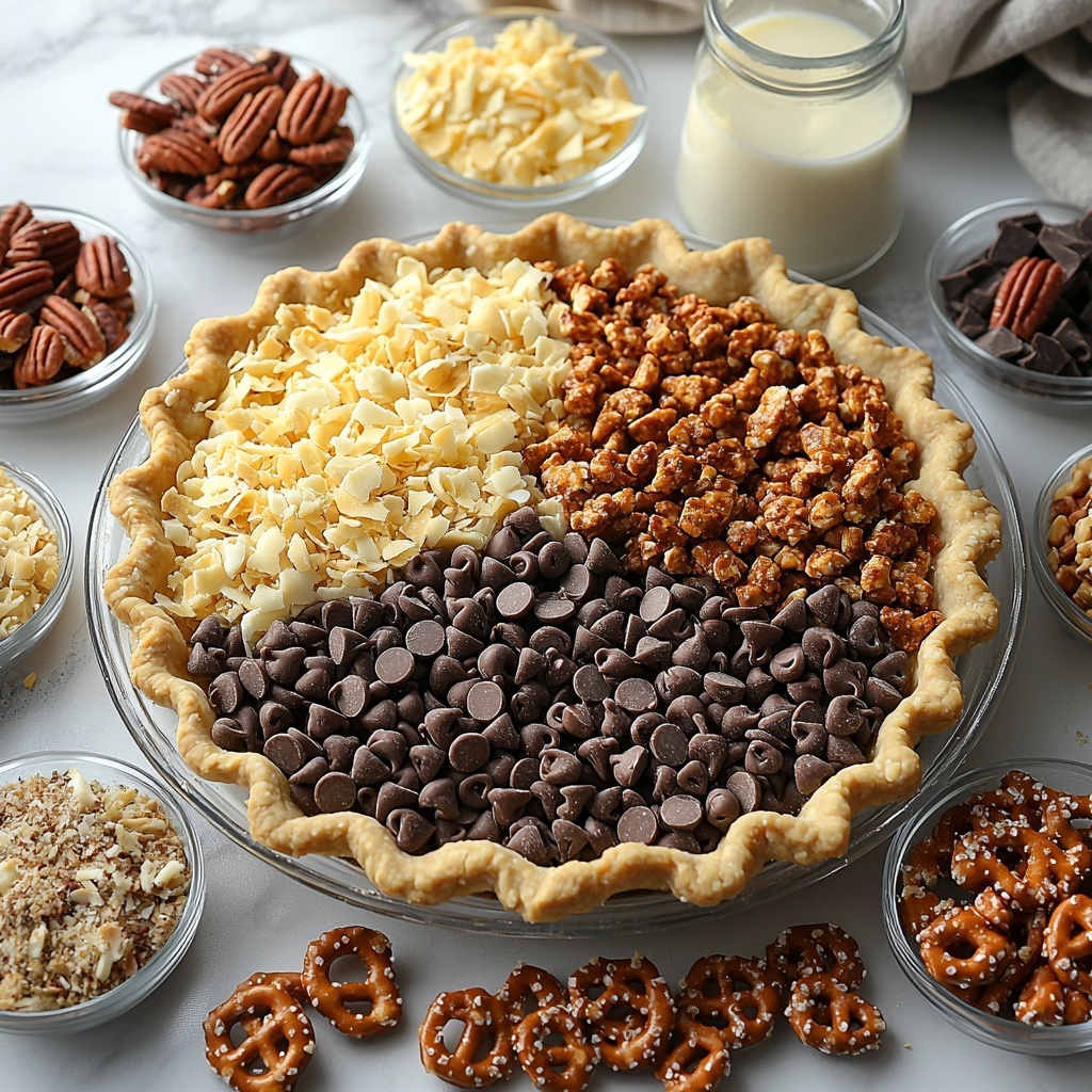 In a large bowl, gather your sweetened condensed milk, semi-sweet chocolate chips, toffee bits, crushed pretzels, shredded coconut, and chopped pecans. This flavorful combination of ingredients is the heart of the Texas Trash Pie Recipe, blending sweet, salty, and crunchy notes that make every piece unforgettable.