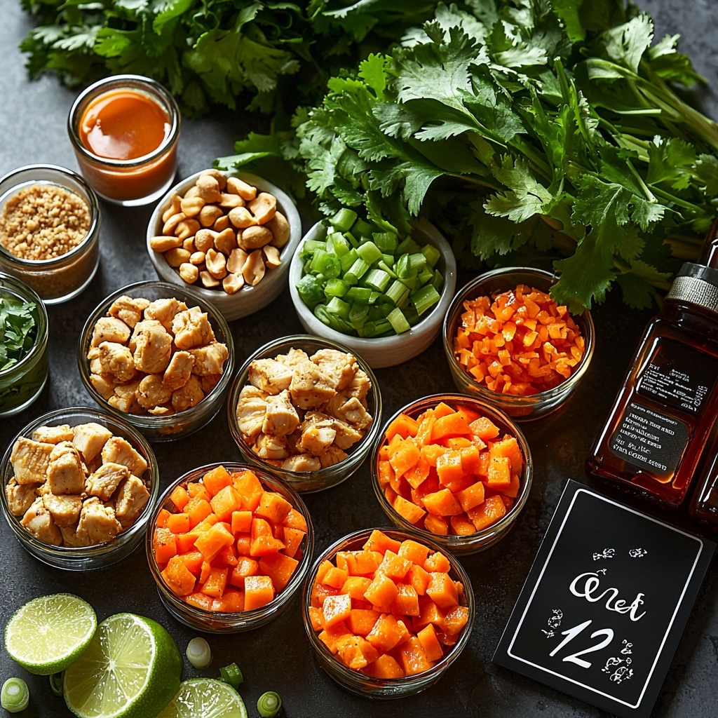 - Assemble the wraps: Spoon the peanut chicken mixture into baby butter lettuce leaves. Top each with sliced green onions, shredded carrots, chopped peanuts, and chopped cilantro. Garnish with additional cilantro and a lime wedge on the side for squeezing over the wraps.