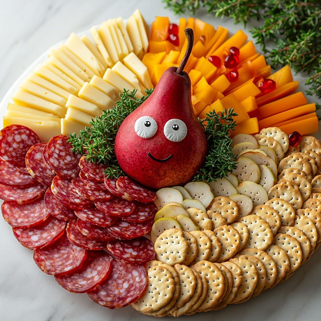 A festive and visually stunning Thanksgiving appetizer platter featuring a creative turkey design made from fresh pears, an assortment of cheeses, crackers, salami, vegetables, and nuts. Perfect for holiday gatherings, this no-cook platter is easy to assemble and sure to impress your guests with both flavor and presentation.