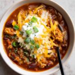 - Serve and garnish: Ladle the chili into bowls and top with your choice of garnishes such as Mexican cheese blend, fresh cilantro, sour cream or Greek yogurt, and sliced avocado.
