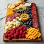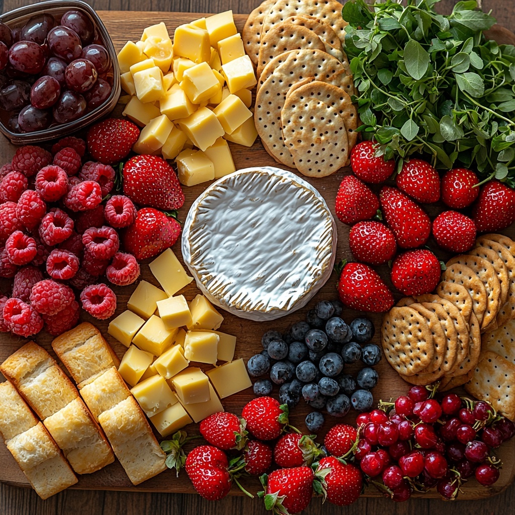Next, tuck in the colorful fruits like strawberries, blueberries, and grapes in groups near the cheeses, allowing their natural sweetness to contrast with the savory flavors. The fresh fruits also add vibrant pops of color, making the board visually irresistible.