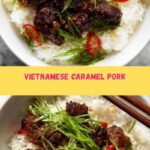 - Serve: Serve the Vietnamese caramel pork hot over steamed rice. Garnish with fresh sliced red chili and shallots or green onions. Serve alongside simple pickled vegetables to add acidity and contrast to the rich pork.